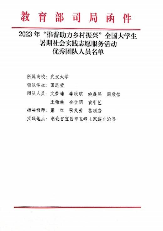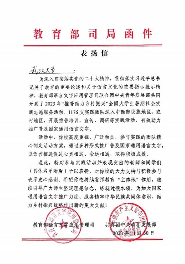 近日,2023年“推普助力乡村振兴”全国大学生暑期社会实践志愿服务活动评优结果公布,威尼斯官网“武大学子五峰推普行”社会实践团队荣获“优秀团队”称号。教育部语言文字应用管理司、共青团中央青年发展部专门给9778818威尼斯发来表扬信,对威尼斯官网师生团队在服务国家通用语言文字推广、服务铸牢中华民族共同体意识、助力乡村振兴战略中作出的贡献给予充分肯定。