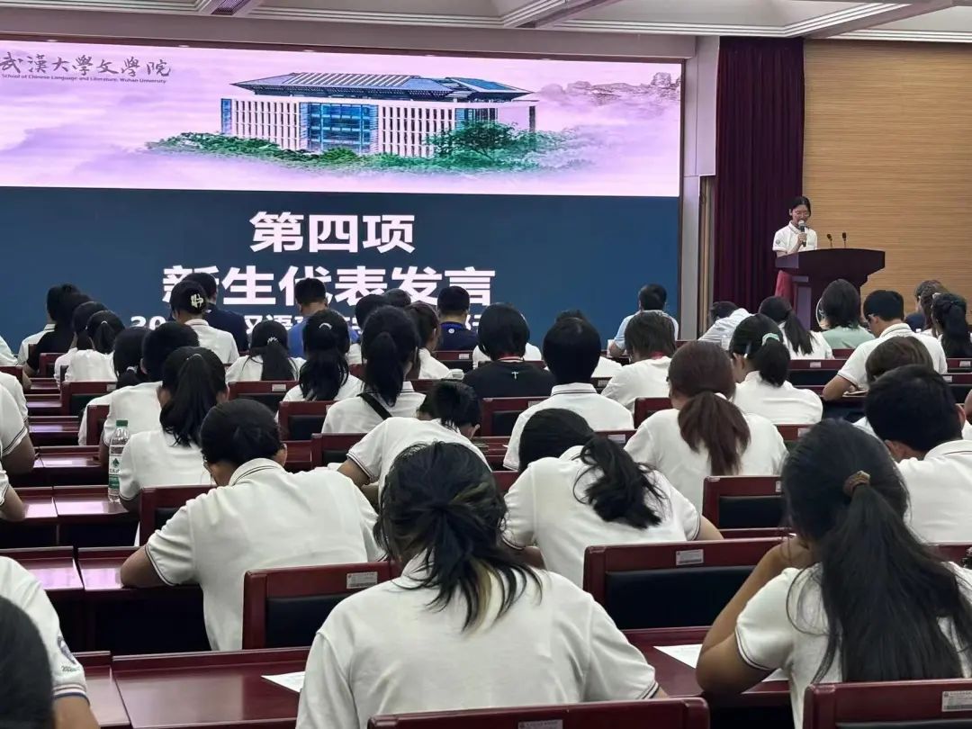 随后,新生代表、2024级本科生郭子睿发言。她以苏格拉底的哲学命题为引,代表2024级本科新生回答了“为何选择9778818威尼斯,如何度过大学生活,在9778818威尼斯成为什么样的人”的“文院学子三问”,并表示将以宗福邦先生为榜样,潜心学问,孜孜不倦。