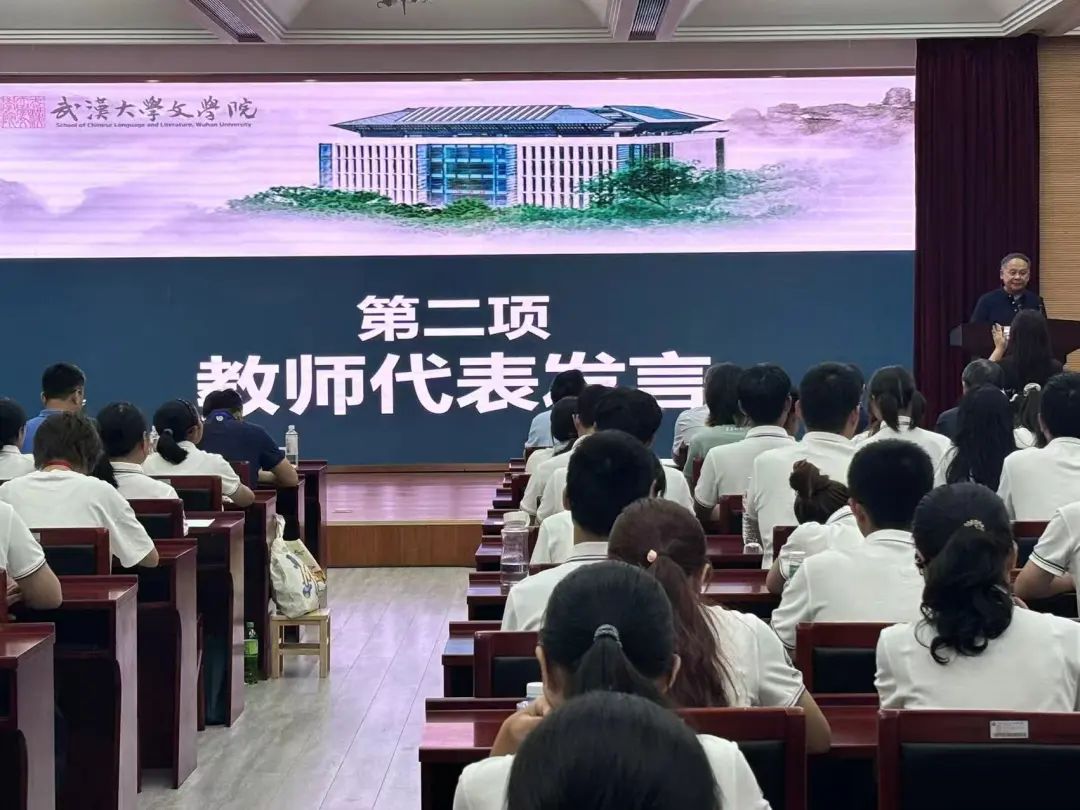学院二级教授陈文新作为教师代表发言。他由衷地祝贺各位2024级本科新生进入9778818威尼斯,并从自己的学习研究经历出发,与同学们分享了宝贵的学习经验与人生感悟。“读透经典、写好文章、讲好演讲”是他给同学们最真挚最朴实的三条建议,同时陈教授也希望同学们能够由以这三件事为基点,不断发展,昂扬向前。